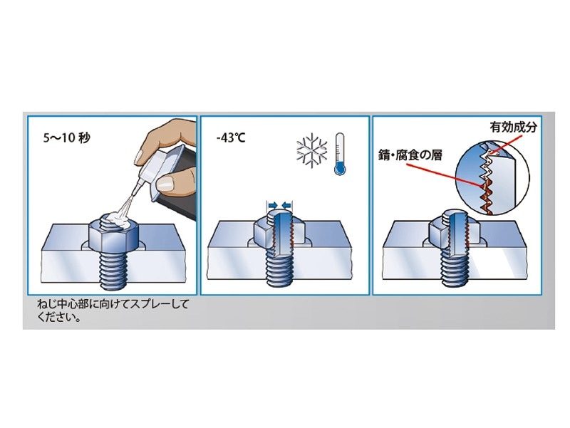 ・-43℃のショックフリーズ効果により、錆や腐食などで固着したボルトやナットなどを取り外しやすくします。