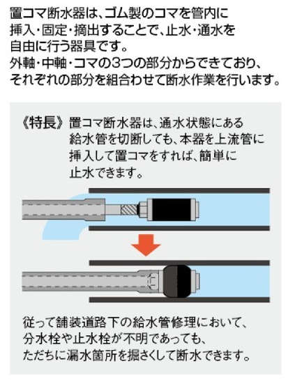 ・管内に置コマを挿入、摘出することで止水、流水を自由に行う器具です