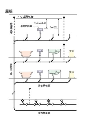 ・床面より1m以上かつ、器具アフレ面より150mm以上のパイプ先端に取り付けると、管内負圧時のみ吸気します。(通常時、弁は閉まっていて、管内の臭いは漏れません)