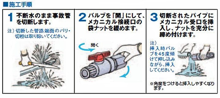 ・断水の必要もなく、簡単、迅速に事故管の補修ができます。