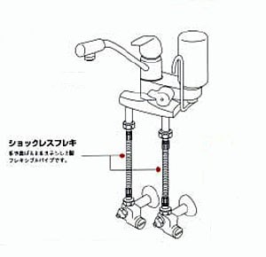 *ショックレスフレキは水撃を暖和する器具です。水撃による衝撃音は、配管の支持方法、共鳴、建築構造の要因からショックレスフレキを設置しても解消されないことがあります。