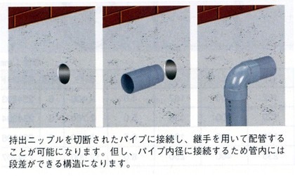・壁面や床面で切断されたVP管の配管に。ツラ切りされたパイプの延長が可能です。