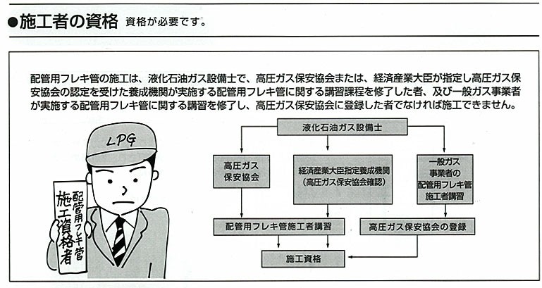 液化石油ガス設備士の有資格者で高圧ガス保安協会または経済産業大臣が指定し、高圧ガス保安協会の確認を受けた養成機関が実施するフレキ管施工者講習の課程を修了した者及び都市ガス業者が実施する配管用フレキ管に関する講習の課程を修了し、高圧ガス保安協会に登録した者。