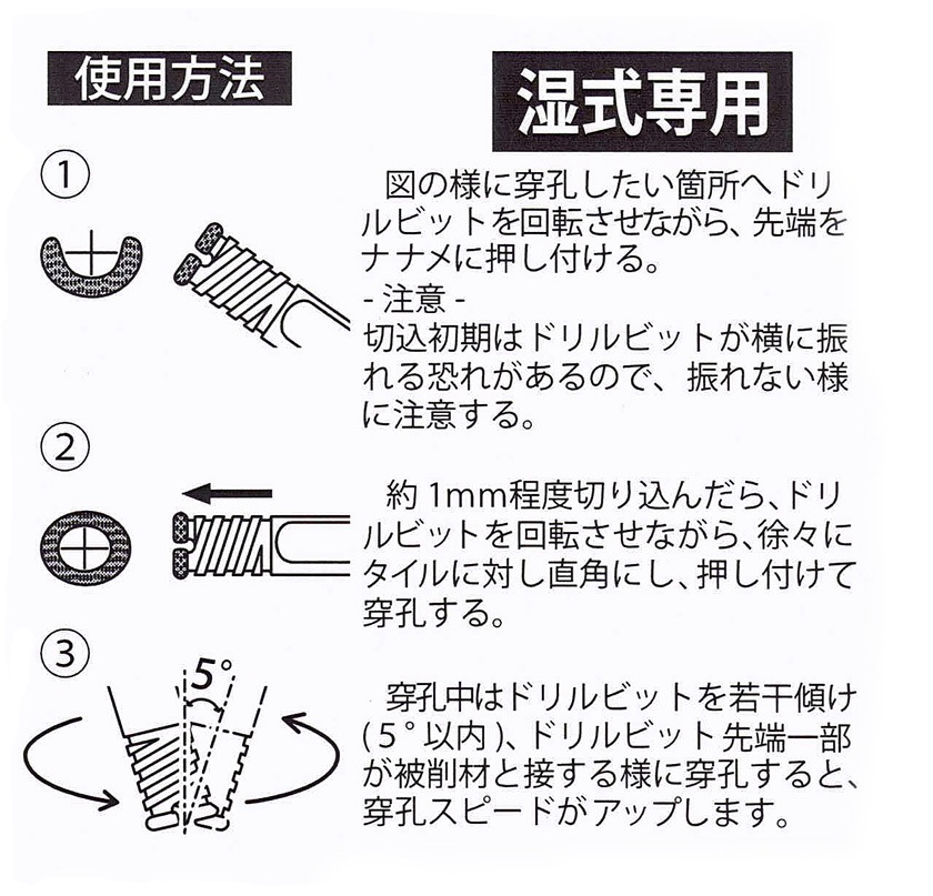 ・湿式用です。必ずドリルビット先端にスポンジやスプレー等で注水して使用して下さい。
