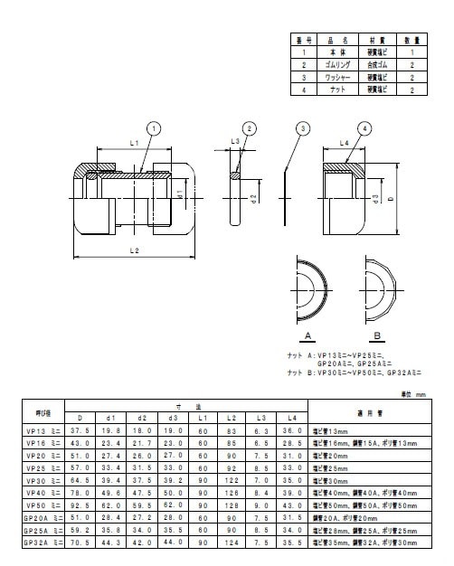・塩ビ管、ポリ管、鋼管用に対応しています。(呼び20,25,30はVP管専用です)