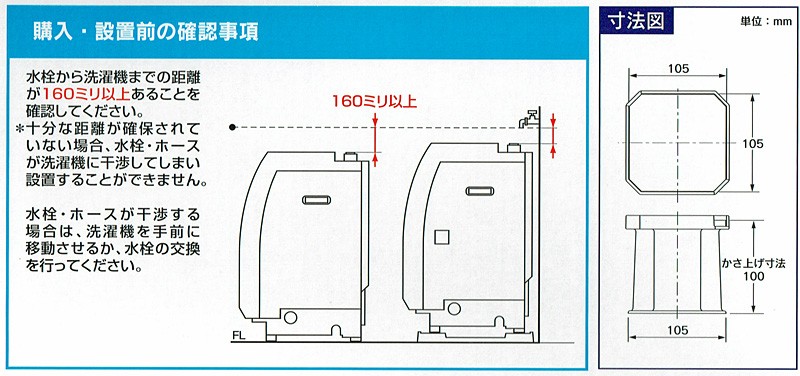 ・事前に水栓から洗濯機までの距離が160ミリ以上あること確認しておいてください。