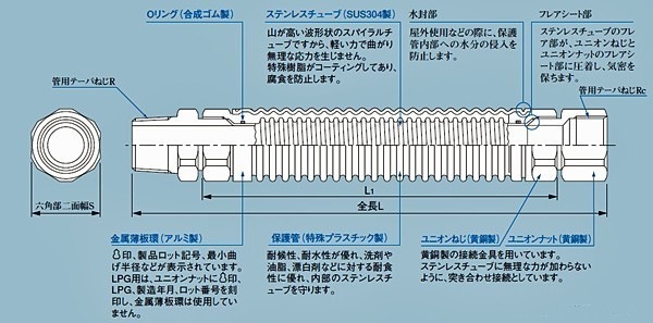 ・LPガス用の燃焼器用金属フレキシブル管です。