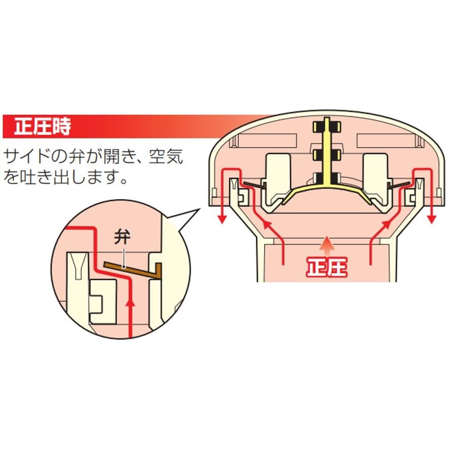 ・通常時は空気を遮断していますが、排水管内に正圧・負圧が発生した場合には弁が開き、空気を出し入れして排水管内の圧力を調整します。