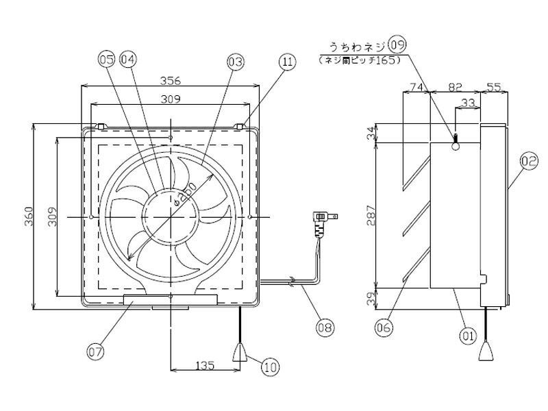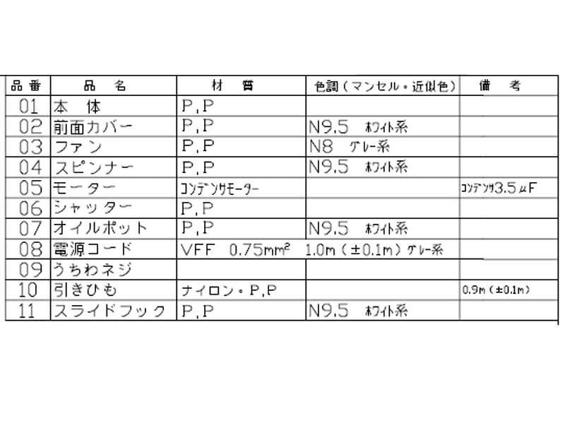 ・羽根、前面カバーは樹脂製、本体は鋼板製