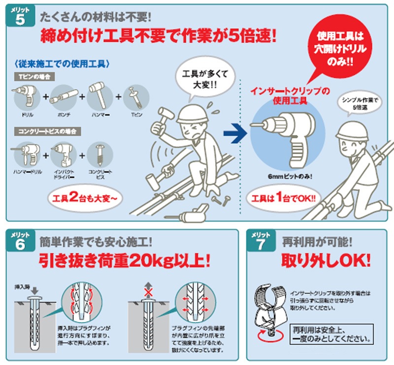 インサートクリップは軽量物専用サドルです。クリップのプラグ部分のコンクリート下地での引き抜き強度は全て20kg以上ありますが、タイプ形状により荷重強度が異なります。それぞれの適正荷重範囲内でご使用ください。