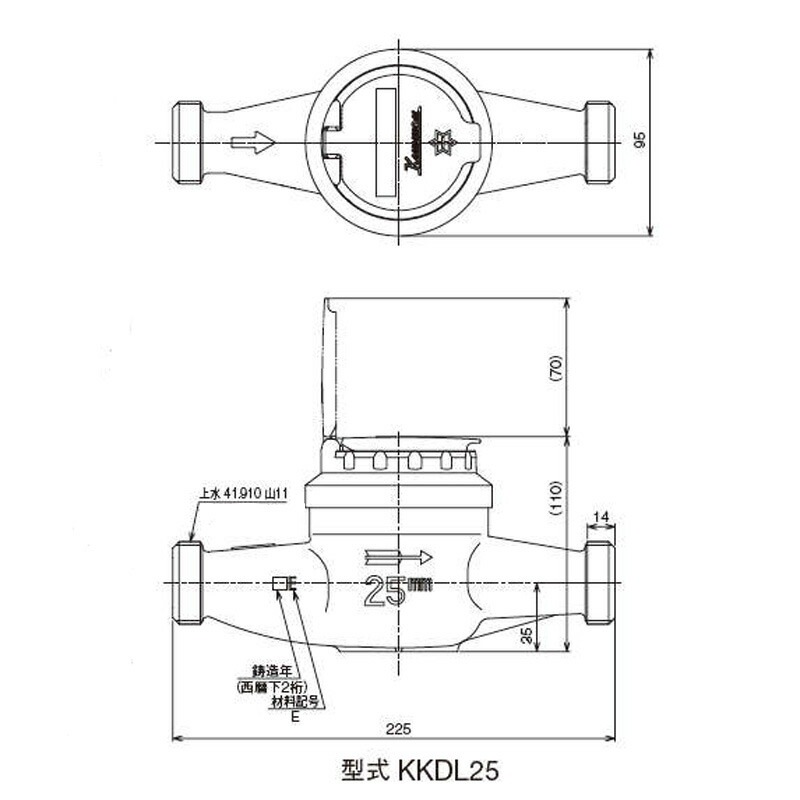 【13時迄は当日発送 日祝除く】 水道メーター 量水器 子メーター 表示部回転式 マワリーナ 25ロング 面管寸法225mm KKDL25 J 上水ネジ