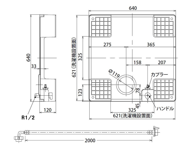 洗濯機パン 水栓付 フラット 防水パン 水栓コンセント内蔵型 洗濯 トレイ SP1391N サイズ 640x640mm