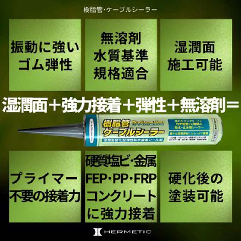 ・接着能力と防水能力を併せ持った多用途接着剤です。各種樹脂管まわりの隙間処理、電線ケーブルまわりのすき間処理に最適です。